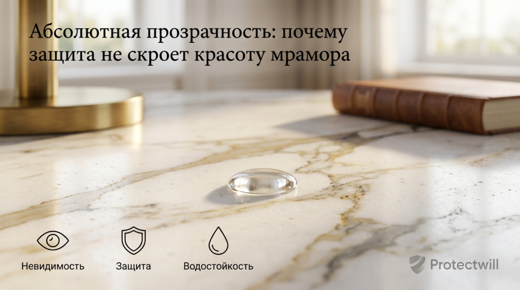 Мрамор, при всей своей твердости, имеет пористую структуру, которая жадно впитывает жидкости. Обычный пролитый кофе меняет преломление света в порах камня, создавая темное пятно, которое невозможно вывести. Именно поэтому защита камня пленкой Protectwill включает Top Coat — гидрофобный барьер, который не только оптически прозрачен, но и физически запечатывает поверхность, не давая пигментам проникнуть внутрь структуры.