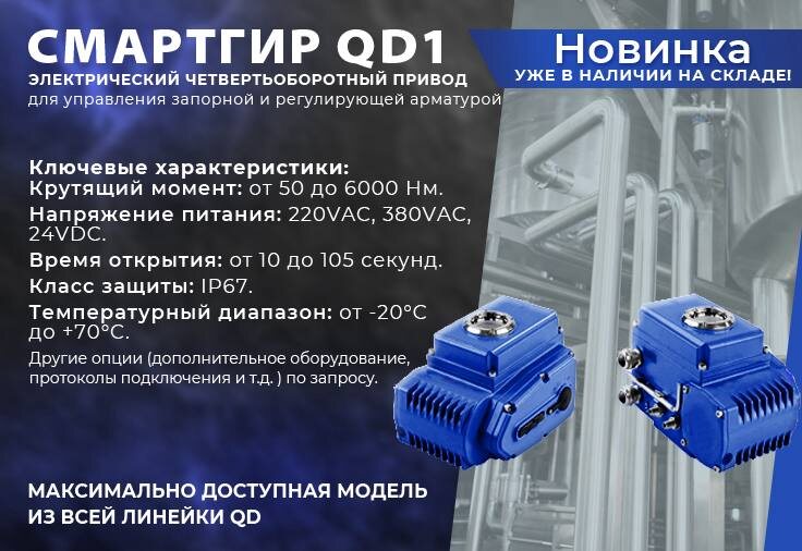 ⚡⚡ Мы с гордостью представляем вам новую линейку электрических четвертьоборотных приводов «Смартгир» серии QD1. Эти приводы разработаны для управления запорной и регулирующей арматуройи сочетают в себе компактные размеры, а так же низкую стоимость и при этом высокую надежность, свойственную всей продукции, производимой на нашем заводе. 🔍Ключевые характеристики: 📍Крутящий момент: от 50 до 6000 Нм. 📍Напряжение питания: 220VAC, 380VAC, 24VDC. 📍Время открытия: от 10 до 105 секунд. 📍Класс защиты: IP67. 📍Температурный диапазон: от -20°C до +70°C. Дополнительное оборудование (опционально): 📌Блок местного управления; 📌Датчик положения и позиционер для управления приводом (4…20 мА); 📌Блок возврата в исходное положение 📌Интерфейсы связи: ModBus-RTU, ModBus-TCP, Profibus-DP, HART. 🧑🏭Почему Вам подойдет серия QD1: Компактные размеры – идеально подходят для арматуры малых диаметров и ограниченного пространства. Универсальность – возможность местного или дистанционного управления