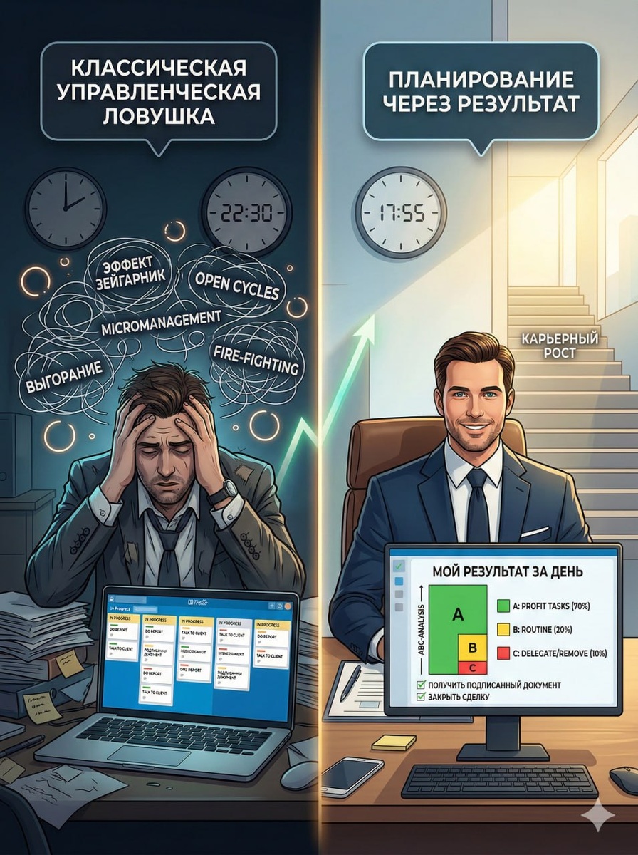 Вчера на сессии разбирали классический кейс. Компетенций у клиента хватает на уверенную позицию топ-менеджера, но 90% рабочего времени уходит на микроменеджмент и тушение чужих операционных пожаров. В трекере десятки задач, работа уходит на дом, а главное чувство к концу недели звучит так: «Делаю очень много, но завершенности и результатов не вижу. Сплошное выгорание». Это классическая управленческая ловушка, которая держится на одном интересном свойстве нашей психики. В психологии есть понятие «Эффект Зейгарник». Его суть проста: наш мозг прекрасно помнит прерванные или незавершенные действия и очень быстро вычищает из памяти законченные. Когда ваше ежедневное планирование состоит из процессов («делать отчет», «согласовывать договор», «разбираться с подрядчиком»), задача не имеет четкой точки финиша. Мозг не получает команду «сделано» и оставляет этот процесс висеть в фоновом режиме. Десятки таких незакрытых циклов сжирают когнитивную энергию, создают перманентную тревогу и лишают