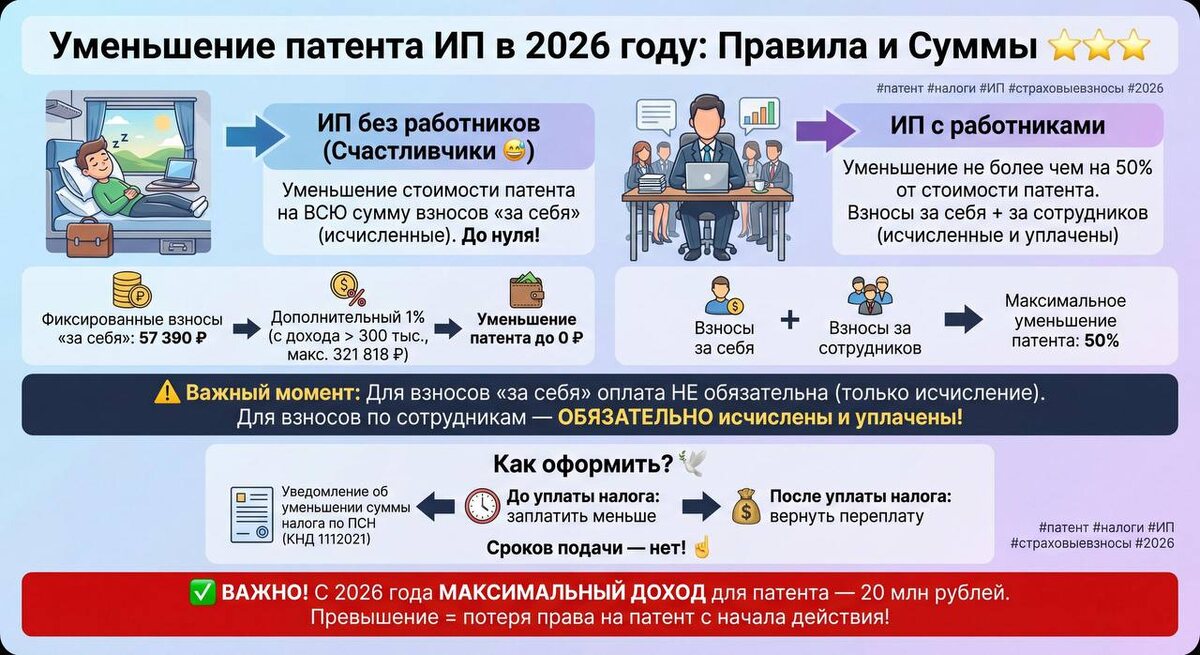 Всегда завидовала тем, кто пришёл, лёг — и спит всю дорогу. Счастливчики 😅 А теперь — к продолжению опроса про уменьшение патента. Разбираемся, что и как в 2026 году.🕊 ⭐️⭐️⭐️ В 2026‑м правила уменьшения стоимости патента на страховые взносы остаются прежними — но важно учитывать актуальные суммы фиксированных платежей и правила для МСП. 📌 ИП может уменьшить стоимость патента на уплаченные (или исчисленные) страховые взносы. 🔜 Если у вас нет работников — патент можно уменьшить на всю сумму взносов «за себя» (фиксированные + 1% с дохода свыше 300 тыс.). Уменьшение — до нуля. 🔜 Если есть работники — уменьшить можно не больше чем на 50% от стоимости патента. В расчёт идут взносы и за сотрудников, и за вас. 👇 Что брать за основу в 2026 году: ➡ Фиксированные взносы «за себя»: 57 390 ₽ ➡ Дополнительный 1%: с дохода свыше 300 000 ₽ (максимум — 321 818 ₽) ⚠️ Важный момент: ✔ Для взносов «за себя» оплата не обязательна— достаточно, чтобы они были исчислены. ✔ Для взносов по сотрудн