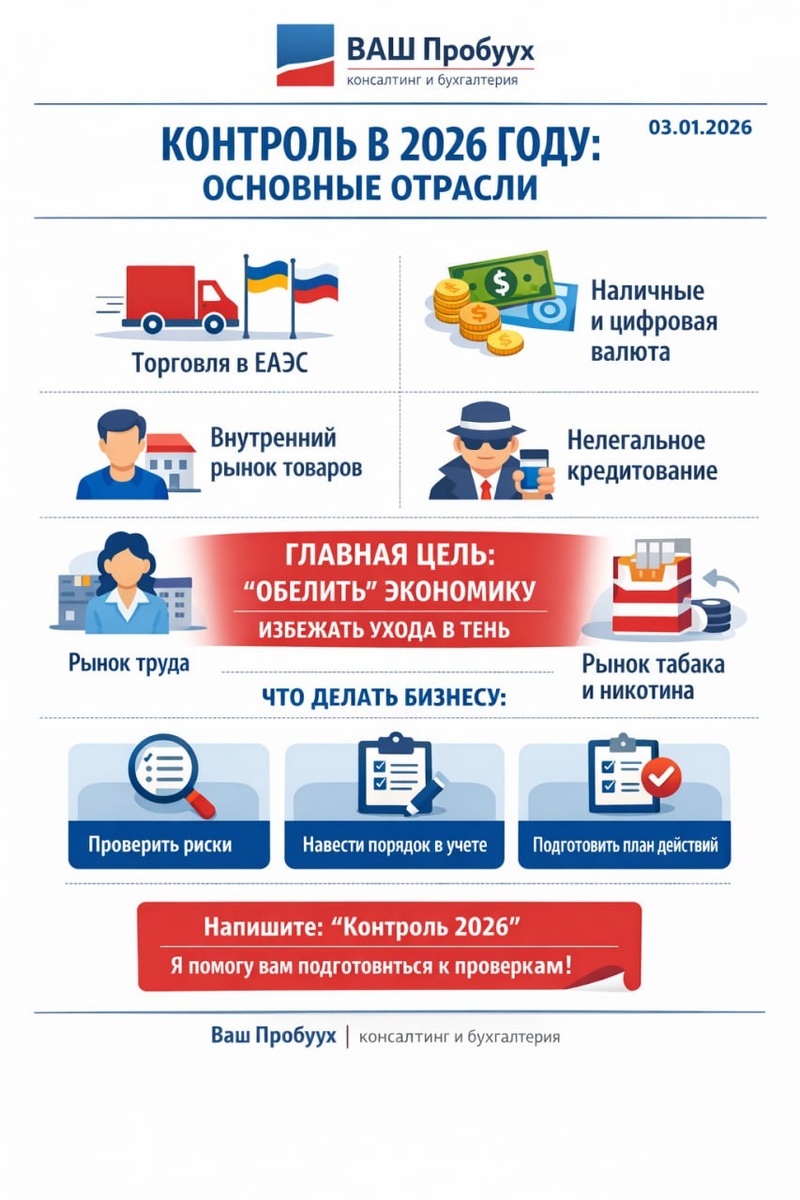 С 2026 года налоговые органы будут активнее «обелять» экономику — соответствующее поручение всем ведомствам дал Президент (информация от 03.01.2026). Правительство уже утвердило план по шести секторам, где уровень теневой деятельности оценивается как наибольший (распоряжение от 29.11.2025 № 3523-р). Под особым контролем окажутся: Торговля в рамках ЕАЭС (в том числе документы по сделкам, корректность НДС, цепочки поставок). Внутренний рынок товаров (прослеживаемость, легальность происхождения, расчеты, работа с контрагентами). Рынок труда (нелегальная занятость, подмена трудовых отношений, выплаты «в конвертах»). Оборот наличных денег и цифровой валюты (кассовая дисциплина, подтверждение операций, прозрачность расчетов в цифровом пространстве). Нелегальное кредитование (сомнительные займы, схемы с процентами, неформальные финансовые услуги). Рынок табака и никотинсодержащей продукции (акцизы, маркировка, «серый» товар, нелегальная розница/опт). Почему контроль усилят: ключевая ц