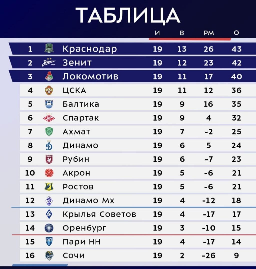 ⚽️ Тройка лидеров одерживает минимальные победы. ЦСКА отваливается (3 поражения в 4 последних играх РПЛ), "Спартак" побеждает в многострадальном матче в Сочи и приближается к "Балтике". ⚽️ Внизу победы одерживают "Оренбург" и новый клуб Вадима ЕВСЕЕВА из Махачкалы. Борьба за выживание обостряется. РПЛ после 19 тура: лидеры: 🟢🔵🟢 стыки: 🔷🔵 вылет: 🔵🔴 ⚽️ "Урал", зимой поменявший Мирослава РОМАЩЕНКО на В. Березуцкого, проиграл уверенно лидирующему "Факелу" и теперь лишь на 2 очка опережает "Родину". Удивительный костромской "Спартак", который за 11(!) последних игр одержал всего 1 победу, всё ещё в топ-4. Но по очкам с ним уже сравнялся "Челябинск" Романа ПИЛИПЧУКА. И в следующем туре команды сыграют между собой. ⚽️ "Ротор" поменял Дениса БОЯРИНЦЕВА на Дмитрия ПАРФЁНОВА, но побед пока нет (1:1 с Костромой). Те же 1:1 у "Арсенала" Дмитрия ГУНЬКО в Челнах. "Торпедо" КОНОНОВА Олега обыграло покинутый ЕВСЕЕВЫМ "Черноморец" и уже может не беспокоиться за место в Лиге. ⚽️ Все 3 аут