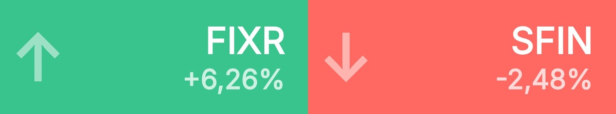: Фикс Прайс • 0,60 ₽ • 6,26% РуссНефть • 143 ₽ • 5,74% Татнефть п • 601 ₽ • 5,10% Татнефть • 628 ₽ • 3,41% Роснефть • 448 ₽ • 2,89% Новатэк • 1 293 ₽ • 1,31% Совкомфлот • 79,35 ₽ • 1,21% Группа Рус • 122 ₽ • 0,72% Северсталь • 951 ₽ • 0,53% ЮМГ • 857 ₽ • 0,46% 🔻 Топ-10 лидеров падения среди крупнейших акций: ЭсЭфАй • 842 ₽ • -2,48% Селигдар • 58,20 ₽ • -1,84% М.Видео • 72,50 ₽ • -1,76% ТГК-1 • 0,01 ₽ • -1,47% Полюс • 2 510 ₽ • -1,29% Циан • 585 ₽ • -1,25% Мосэнерго • 2,19 ₽ • -1,22% Норильский • 159 ₽ • -1,18% Московский • 5,79 ₽ • -1,16% Эн+ • 486 ₽ • -1,11%