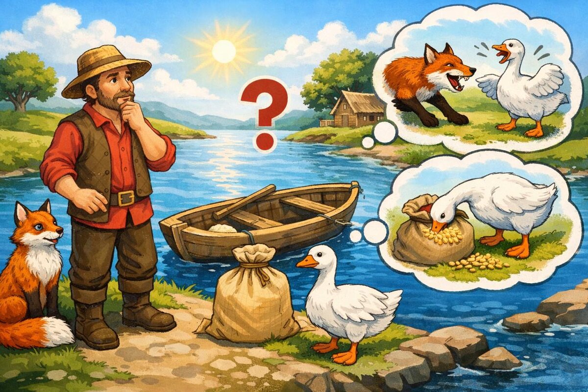 ✏️ Условие: Фермеру нужно переправиться через реку. С собой он должен перевезти: 🦊 лису 🪿 гуся 🌾 мешок зерна Есть лодка, но в неё помещается только сам фермер и кто-то один: либо лиса, либо гусь, либо мешок зерна. ⚠️ Ограничения: 1️⃣ Если оставить лису и гуся без фермера — лиса съест гуся. 2️⃣ Если оставить гуся и зерно без фермера — гусь склюёт зерно. 3️⃣ В присутствии фермера никто никого не трогает. Задача: Как фермеру перевезти всех на другой берег так, чтобы никто никого не съел и ничего не пропало? Напишите своё решение в комментариях 👇 Посмотрим, кто умеет просчитывать шаги наперёд 😉