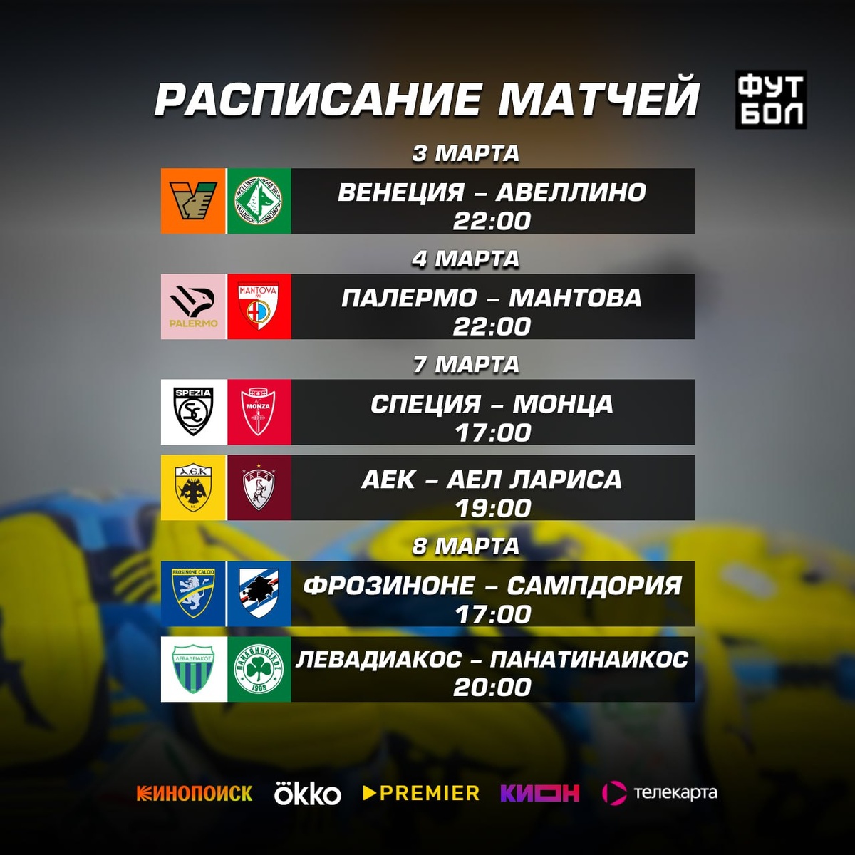 » 3 марта в 22:00 Венеция-Авеллино 4 марта в 22:00 Палермо-Мантова 7 марта в 17:00 Специя-Монца 7 марта в 19:00 АЕК-АЕ Лариса 8 марта в 17:00 Фрозиноне-Сампдория 8 марта в 20:00 Левадиакос-Панатинаикос Лидер Серии B Венеция дома примет середняка Авеллино и постарается укрепить своё лидерство, Палермо, один из главных претендентов на повышение, должен уверенно разобраться дома с аутсайдером Мантовой, Специя встретится с мощной Монцей — одним из лидеров лиги, а Фрозиноне примет Сампдорию, борющуюся за сохранение места в дивизионе, в принципиальном и важном для обеих команд поединке. В греческой Суперлиге АЕК дома обязан уверенно обыграть явного аутсайдера из Лариссы, тогда как Левадиакос на своём поле попытается создать проблемы фавориту Панатинаикосу, где интрига вполне может сохраниться до финального свистка. 📺 Это мы смотрим!