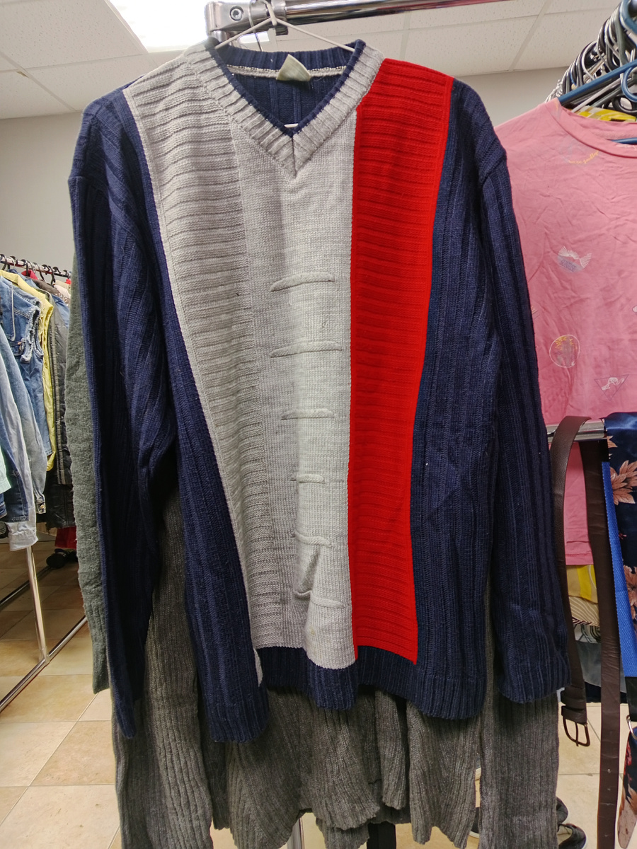 Эх, в далёких 80-х очень модная вещица была. Видно хозяину эта мода тоже очень нравилась. Пуловер носили и любили. То что носили видно по трикотажному полотну. То что любили видно по состоянию пуловеров. Зацепок нет, вытянутых ниток нет.