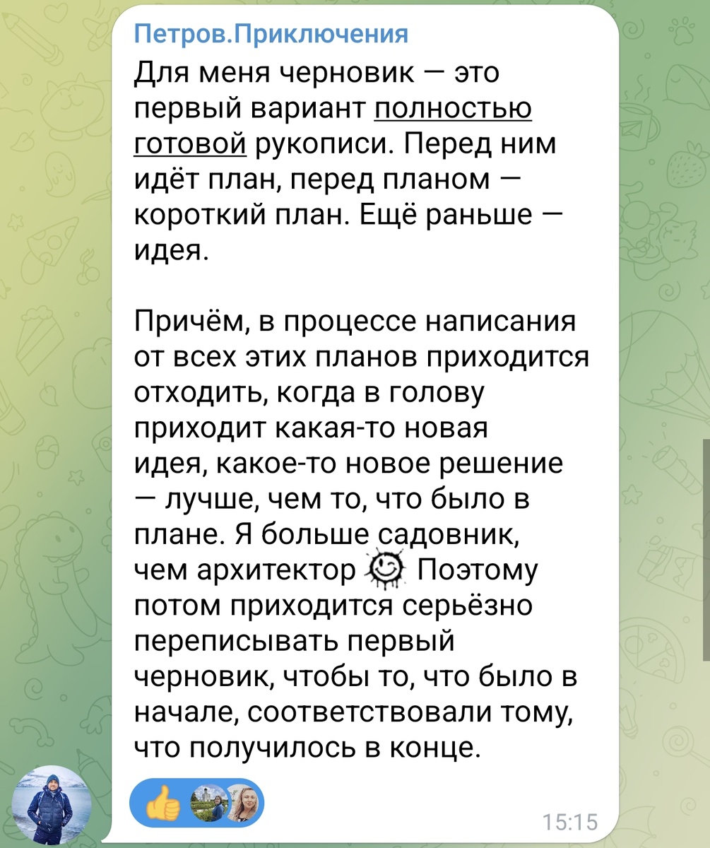 Две разновидности авторов худлита. "Архитекторы и Садовники" - это, вроде бы, наиболее распространенное поименование. "Планировщики и Выдумщики" - это из книги Сомерса "Нам понравилась ваша рукопись!", которую сейчас читаю. Стивен Кинг называет стиль работы Садовников "расчисткой окаменелости". На днях у меня в сообществе ЛитРес в телеграм случился вот такой диалог: Кто о чем, а я о черновиках 😄Но я в самом деле, без лукавства, изначально писала "Дружи со мной" без четкого плана. И вообще предполагала, что будет объем около пары авторских листов. Но реализация увела от идеи очень далеко в сторону. Идея была крайне схематична (как оказалось) и даже карикатурна. Из нее можно было бы сделать что-то в стиле фарс. Но я сразу этого не поняла и начала писать "по-честному", реалистично, с характерными персонажами. И ухнула в эту историю: окаменелость оказалась (не)предсказуемо масштабной. Теперь, ближе к концу, примерный план у меня есть: я уже знаю, кто есть кто из персонажей (в начале не
