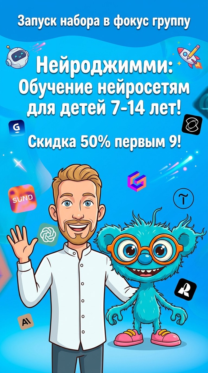 Представляете, какие чудеса они смогут создавать, когда поймут, как дружить с искусственным интеллектом? Это будет не скучно, не сложно, а максимально интересно и по-детски увлекательно. Мы покажем им мир, где технологии — это не просто листать тиктоки, а инструмент для воплощения самых невероятных идей! И, конечно, какой же запуск без сюрпризов? Для первых девяти (!) мест мы приготовили особенный подарок – 50% скидки! Чтобы точно никто не пропустил этот старт в будущее. Если у вас дома живет юный гений, который мечтает создавать что-то своё, то ему точно к нам. Пишите в личку, чтобы узнать все подробности и занять то самое место! Подробнее о курсе на сайте https://chel.neurojimmy.ru/