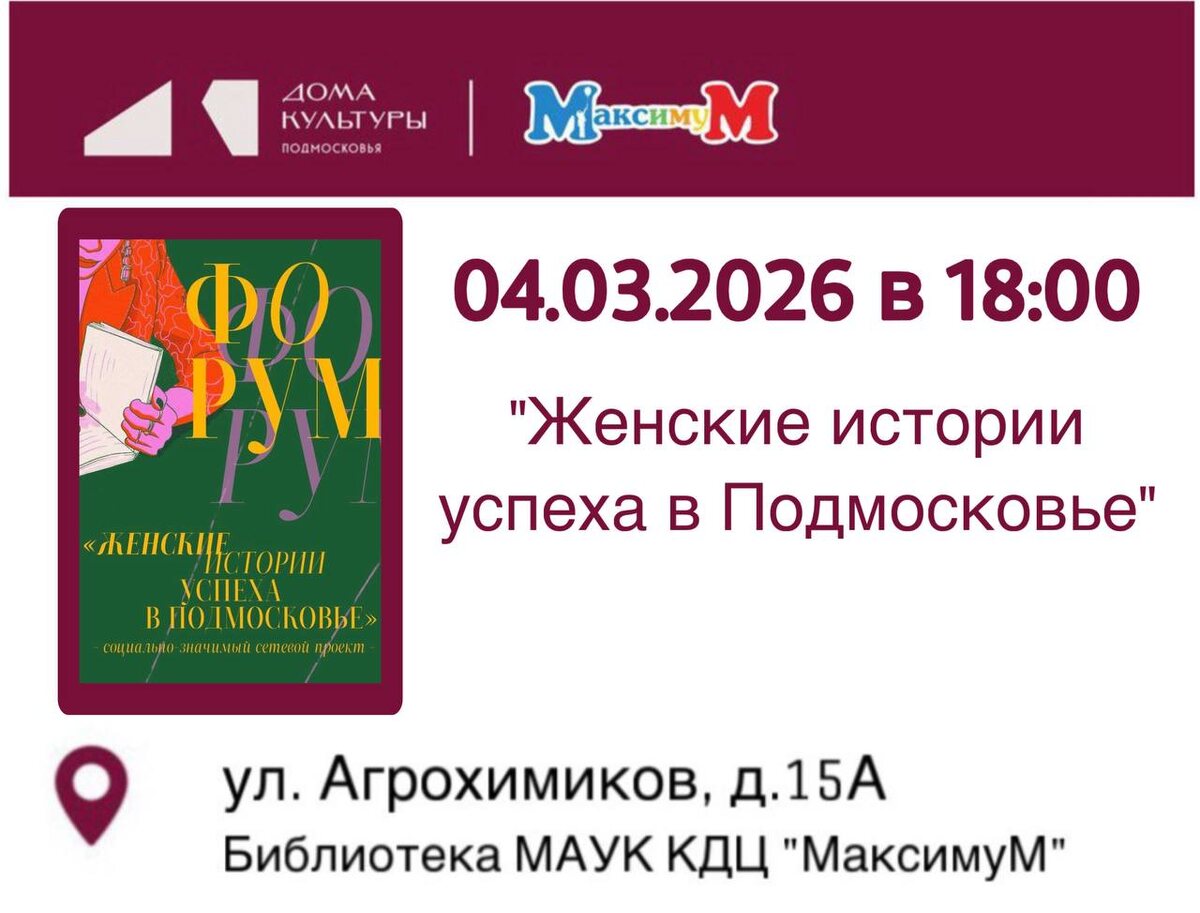 ! Уже завтра, в среду 4 марта 2026 года, в рамках форума «Женские истории успеха в Подмосковье» произойдет встреча, которая перевернет ваше представление о возможностях! ✨ К нам приедет гостья, чьё имя мы до последнего держим в строжайшем секрете. Её путь — это микс науки, медиа, спорта и настоящего волшебства. Она — человек-оркестр, мама двоих детей и живое доказательство того, что «успевать всё» — это не миф, а стратегия. Почему вам стоит прийти? ✅ Услышать историю успеха из первых уст. ✅ Зарядиться энергией перед 8 Марта. ✅ Сделать потрясающие снимки в нашей праздничной фотозоне. ✅ Раскрыть тайну «секретного гостя» лично! 📍 Где: Библиотека МаксимуМ: ул. Агрохимиков, д.15А 🗓 Когда: 4 марта (среда) ⏰ Время: 18:00 📌 Вход свободный! Приходите и сами всё увидите! Такое событие бывает раз в году. 🌸 #ЖенскийФорум #ИсторияУспеха #Новоивановское #СекретныйГость #Подмосковье
