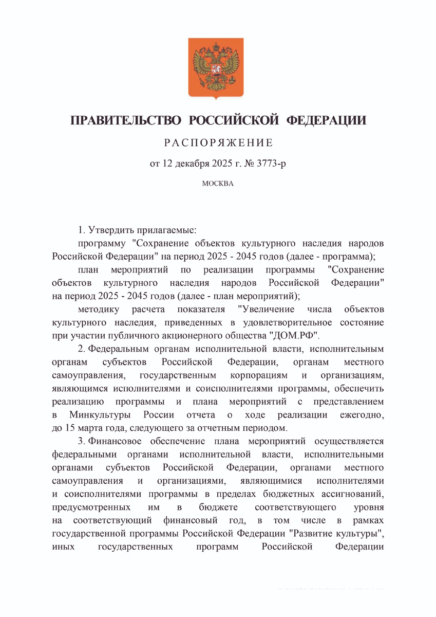 Правительство РФ утвердило программу «Сохранение объектов культурного наследия народов Российской Федерации» на период 2025–2045 годов. Программа разработана во исполнение Поручения Президента России (от 30 марта 2024 г., № Пр-616). Идею долгосрочной программы по сохранению культурного наследия России Владимир Путин выдвинул в Послании Федеральному Собранию 2024 года. Подобная национальная программа – первая в истории нашей страны.