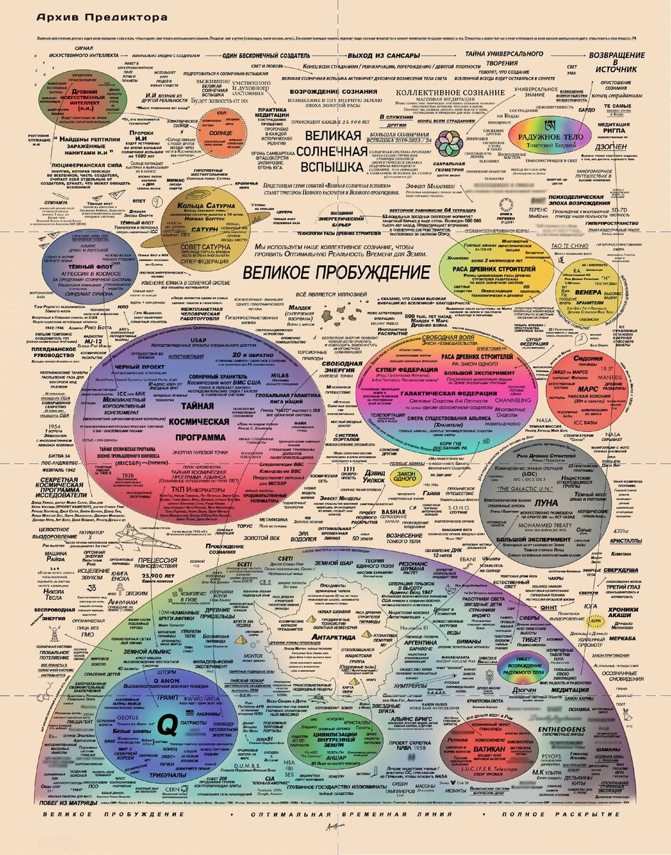 🤯 Перед вами не географическая карта и не документальное исследование, а когнитивная схема мировоззрения. Подобные изображения создаются не для передачи проверяемых фактов, а для объединения множества разрозненных теорий в единую систему. Их задача - показать «скрытые связи». Читать такую карту следует не как доказательную модель реальности на 100%, а как карту мифологического сознания. Но правда в ней тоже есть 1⃣Первое, с чего стоит начать анализ, определить центр композиции В подобных схемах центральный элемент всегда является идеологическим ядром. В данном случае это концепция «Великого пробуждения». Именно она выполняет роль главного нарратива: мир находится в состоянии сна, затем произойдет некое событие, после которого человечество пробудится. Все остальные элементы карты структурированы вокруг этой идеи и подчинены ей 2⃣Далее необходимо выделить крупные тематические кластеры Цветовые зоны обозначают отдельные блоки смыслов: космическая программа, галактическая федерация,