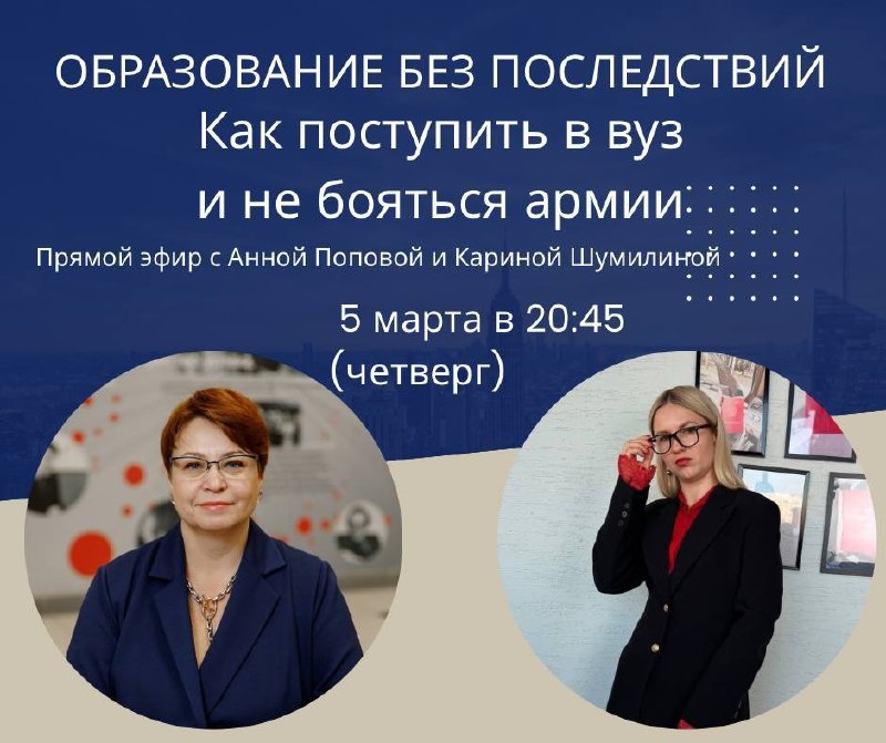» Друзья, мы подготовили для вас не просто разговор, а полноценный навигатор по будущему вашего ребёнка. В этот четверг, встречаемся с двумя экспертами, которые закроют вопросы и по поступлению в вуз, и по «святому» — законному освобождению от воинской обязанности. 📆 5 марта, четверг Начало в 20:45 Эксперты эфира: Карина Шумилина @Karina_Shumilina — репетитор, основатель онлайн-школы, стратег по поступлению в вузы, мама двоих выпускников топ-инженерной школы. · Специализация: поступление в МГУ, МФТИ, МИФИ, МГИМО, МГТУ им. Баумана, топовые школы Москвы. · Результаты: 90% учеников сдают ОГЭ на 5, 80% сдают ЕГЭ на 80+ баллов. · Подход: Поступление в вуз без стресса и с четким планом. · Анна Попова — врач, юрист, руководитель компании «Армихелп». · Специализация: законное освобождение от призыва. · Опыт: 15 лет, более 2500 списанных призывников. · Принцип: помогает даже тем, кто считает себя «абсолютно здоровым». Программа эфира (будет плотно и полезно): Блок 1: Продуманная страт