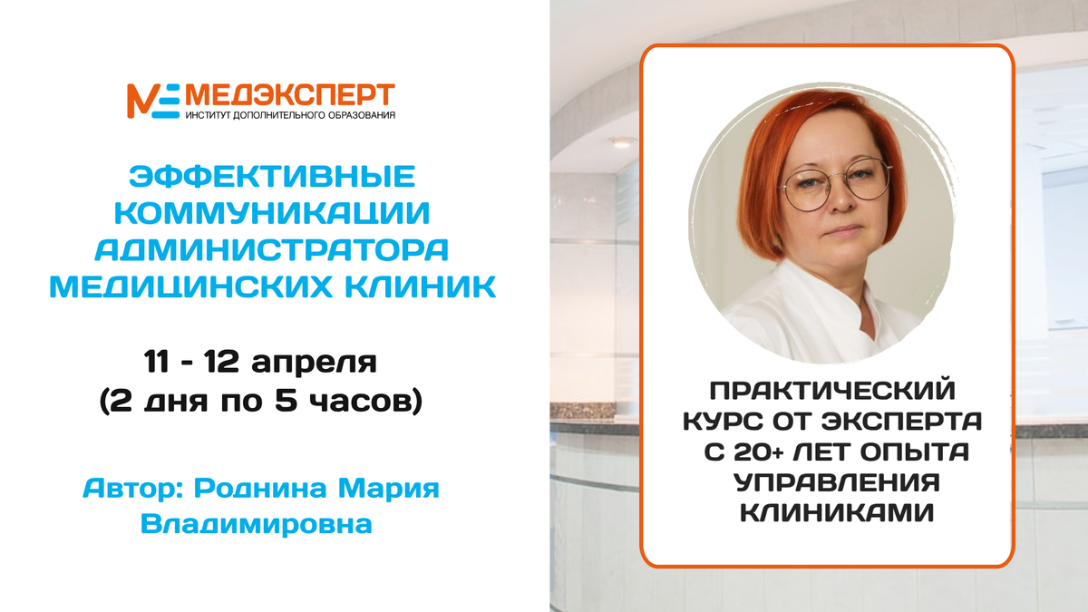 Знакомы ли вам эти ситуации? — лиды сливаются на звонках, допродаж нет, зато есть жалобы и кадровый голод на ресепшене... 👉Переведите коммуникацию «первой линии» на язык ежедневных продаж и получите гарантированный плюс к конверсии и среднему чеку. 💡Очный формат: 11 – 12 апреля (2 дня по 5 часов). 👉Курс создан для администраторов и операторов медицинских клиник, специалистов сферы красоты и здоровья (косметические услуги, эстетическая медицина, СПА-салоны, клиники массажа, стоматологические услуги, многопрофильные клиники и другие), а также для всех, кто интересуется вопросами коммуникации. ✓ Увеличивать конверсию и средний чек; ✓ Создавать безупречный образ клиники с первых секунд; ✓ Управлять своим временем и состоянием; ✓ Выстраивать долгосрочные отношения; ✓ Профессионально гасить конфликты; ✓ Достигать профессиональных целей. ТЕМА 1. Эффективные администраторы: от первых впечатлений до стандартов; ТЕМА 2. Искусство быть администратором: путь к эффективной работе; ТЕМА 3. Эффект