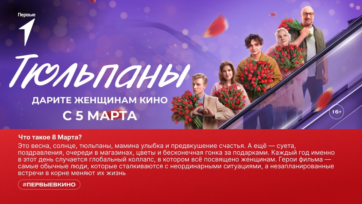 приглашают любимых в кино 💐 Конечно, ведь «Тюльпаны» — это цветы, которые никогда не завянут и ещё долго будут радовать впечатлениями от просмотра. А ещё это возможность отправиться в путешествие по разным городам России вместе с любимыми актёрами — Еленой Яковлевой, Алексеем Серебряковым, Гошей Куценко и другими артистами. Премьера — уже 5 марта. Читай карточки, чтобы поближе познакомиться с картиной и историей праздника ⬆️ и до встречи в кино! #ПервыеВКино