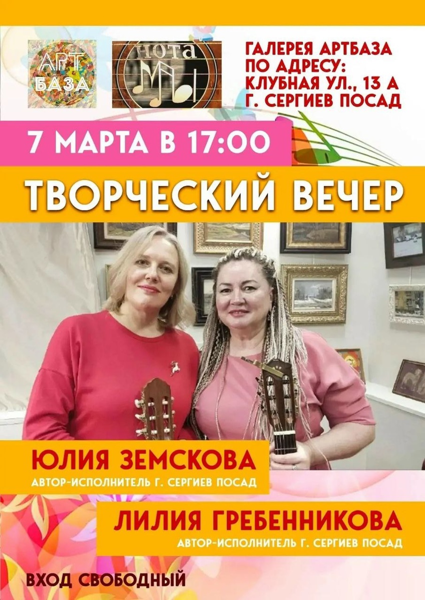 Жду вас 7 марта в канун международного женского дня в 17.00 в АртБазе на наш с Юлией творческий вечер! Приходите, приводите друзей!