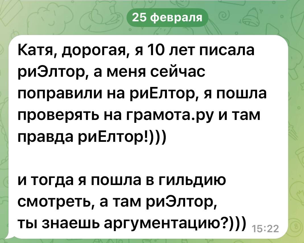 » Друзья, в этом году у меня небольшой, но важный юбилей — 20 лет в профессии. Целая жизнь! И за эти годы был миллион ситуаций, но один вопрос коллеги на днях спровоцировал написать и вам пост Коллега с 10-летним стажем спросила: «Как всё-таки правильно писать? Риэлтор или риелтор? Спойлер для всех, кто сомневается: все варианты правильные. Это заимствованное слово, так что вы не сделаете ошибки. Но у меня, как у человека, который обязан хорошим русским языком своей школьной учительнице Алле Валентиновне, есть любимый вариант. Когда я пишу посты или статьи, я использую слово «РИЕЛТОР». Для меня оно звучит гармоничнее. НО! Если я выступаю в СМИ от имени Гильдий, я строго использую написание «РИЭЛТОР». Потому что в названиях организаций закреплено именно так, и это вопрос уважения к нашему профессиональному сообществу Казалось бы, всего лишь буква. Но для меня это отличная метафора нашего подхода к работе. Мы не просто «риелторы» в базовом понимании этого слова. Мы — специалисты п