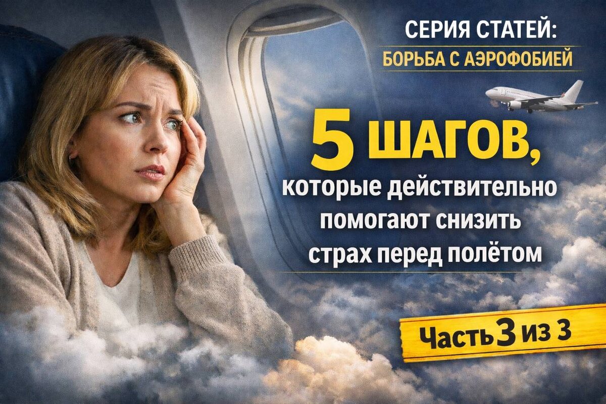 В первой статье мы говорили о том, почему вам страшно летать, даже если вы понимаете, что самолёт безопасен. Во второй — разобрали, что аэрофобия чаще всего связана не с высотой, а с потерей контроля и закреплённой реакцией тревоги. Теперь — самое важное. Что с этим делать? Не в теории. А в реальности. Если вы боитесь летать — вы не «слабый человек». Вы человек с чувствительной системой тревоги. И хорошая новость в том, что тревога — это не приговор. Это навык. А любой навык можно переобучить. Самая распространённая ошибка — пытаться подавить тревогу. «Не думай об этом». «Успокойся». «Возьми себя в руки». Когда вы боретесь со страхом, мозг получает сигнал: «Опасность реальна». И включает тревогу ещё сильнее. Вместо борьбы попробуйте изменить позицию: Не «лишь бы не было паники», а «если будет тревога — я знаю, что с ней делать». Это возвращает ощущение контроля. Когда в голове появляется: «А вдруг самолёт упадёт?» Задайте себе три вопроса: 1. Это факт или предположение? 2. Есть ли ре