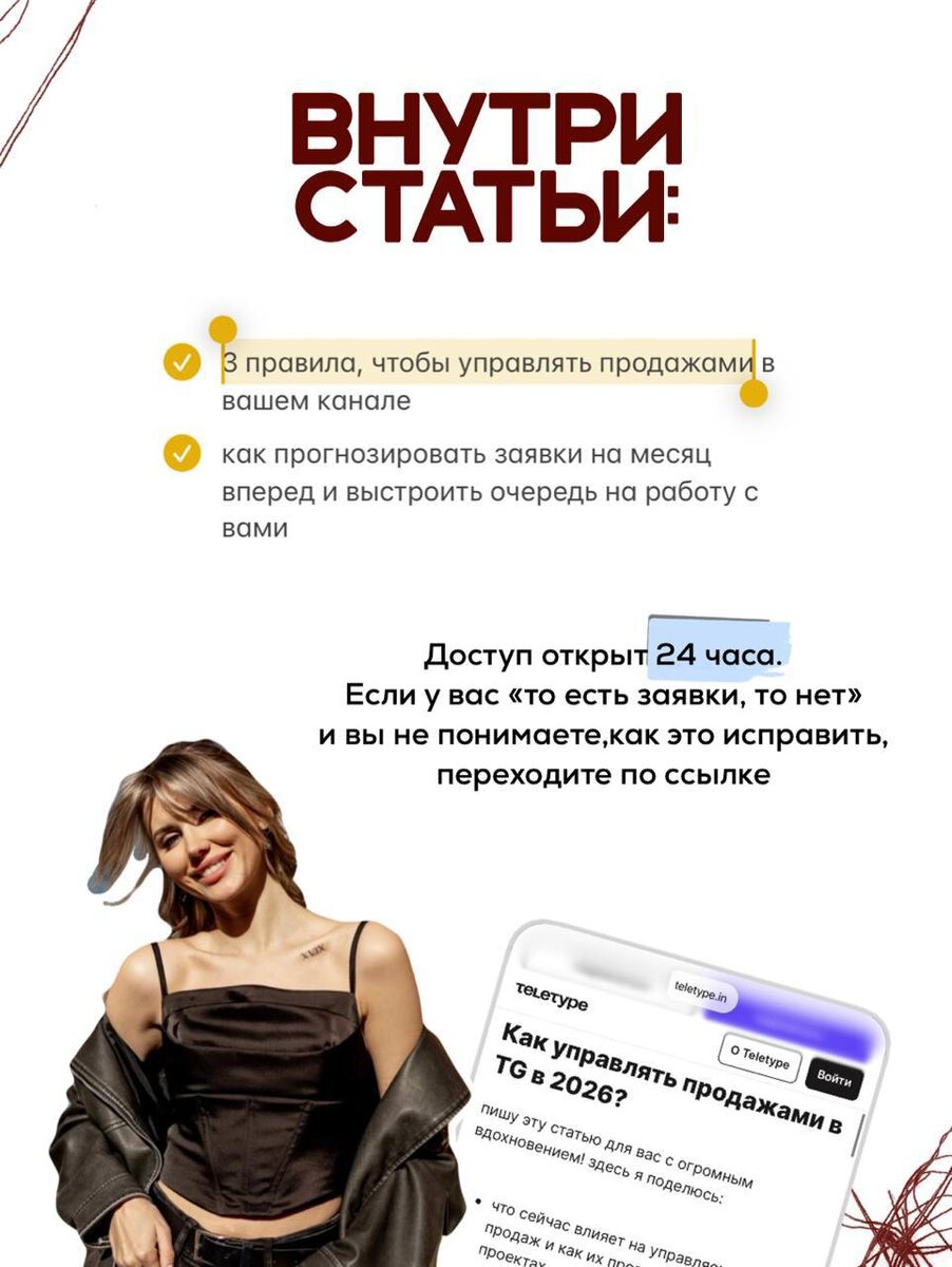 ? Не единоразово или раз в 2 месяца, а чтобы этим можно было управлять и зарабатываться на своей экспертности. Вне зависимости от количества аудитории в вашем канале. Забирайте бесплатный доступ к статье-инструкции от маркетолога. Дарья подробно объяснила: • что сейчас влияет на управляемость продаж и как она их прогнозирует в своих проектах • пример рабочей связки, которая дает продажи на любой чек без бесплатных созвонов • как влиять на свой доход и системно расти в деньгах если вы на этапе "много знаний", а внедрить не получается ➡️ статья разложит вам по полочкам, как это изменить, чтобы был рост заявок если вы на этапе "есть продажи, хочется меньшими усилиями" ➡️ статья покажет вам модель продаж, которая легко масштабируется Подписывайтесь и забирайте статью по этой ссылке [активна 24ч]