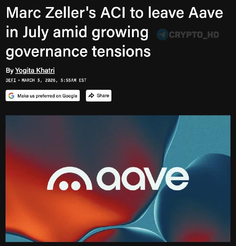 😡 В Aave продолжается управленческий раскол. Aave Chan Initiative (ACI), один из ключевых делегатов и сервис-провайдеров в Aave DAO, объявил об уходе в июле. Команда свернет деятельность в течение четырех месяцев и не станет продлевать контракт. Причина — конфликт вокруг управления и влияния Aave Labs. Спор начался с вопроса о перераспределении комиссий и перерос в дискуссию о том, кто на самом деле контролирует протокол. По словам основателя ACI, текущее голосование показало, что одна сторона способна проводить собственные бюджетные предложения даже при сопротивлении сообщества. Он считает процесс недостаточно децентрализованным. Ранее: - токены изобилия - стратегия развития - особняк основателя Crypto Headlines