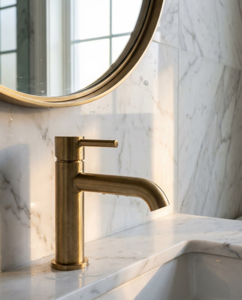 В прошлый раз мы учились строить пространство и наполнять его стилем. Сегодня спускаемся на уровень ниже — к поверхностям. Именно материалы делают интерьер дорогим или дешёвым, тёплым или стерильным. Нейросети отлично умеют рисовать фактуры, если дать им правильные прилагательные. Разбираем четыре кита интерьерного промптинга: камень, дерево, бетон и металл. 🔑 Ключ (Prompt): Вариант 1. Роскошь и контраст (мрамор + латунь) interior detail shot of a luxury bathroom, polished marble walls with natural grey veining, brushed brass faucet and mirror frame, white marble countertop, soft morning light reflecting on metal, subtle reflections, macro photography of surfaces, ultra realistic, 8k --ar 4:5 --style raw *(детальный кадр интерьера роскошной ванной, полированные мраморные стены с естественными серыми прожилками, щеточная латунь смесителя и рамы зеркала, белая мраморная столешница, мягкий утренний свет, отражающийся на металле, тонкие отражения, макросъёмка поверхностей, ультрареалист