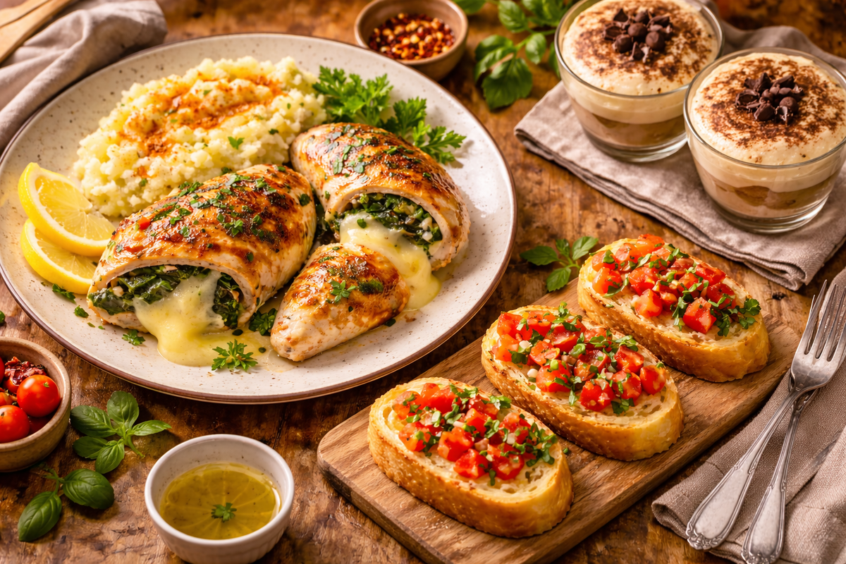Многое можно приготовить заранее. Тирамису лучше сделать с утра — за день он пропитается и станет только вкуснее. Курицу можно нафаршировать днём, а зажарить прямо перед подачей. Брускетту готовьте в последний момент, чтобы хлеб оставался хрустящим.
