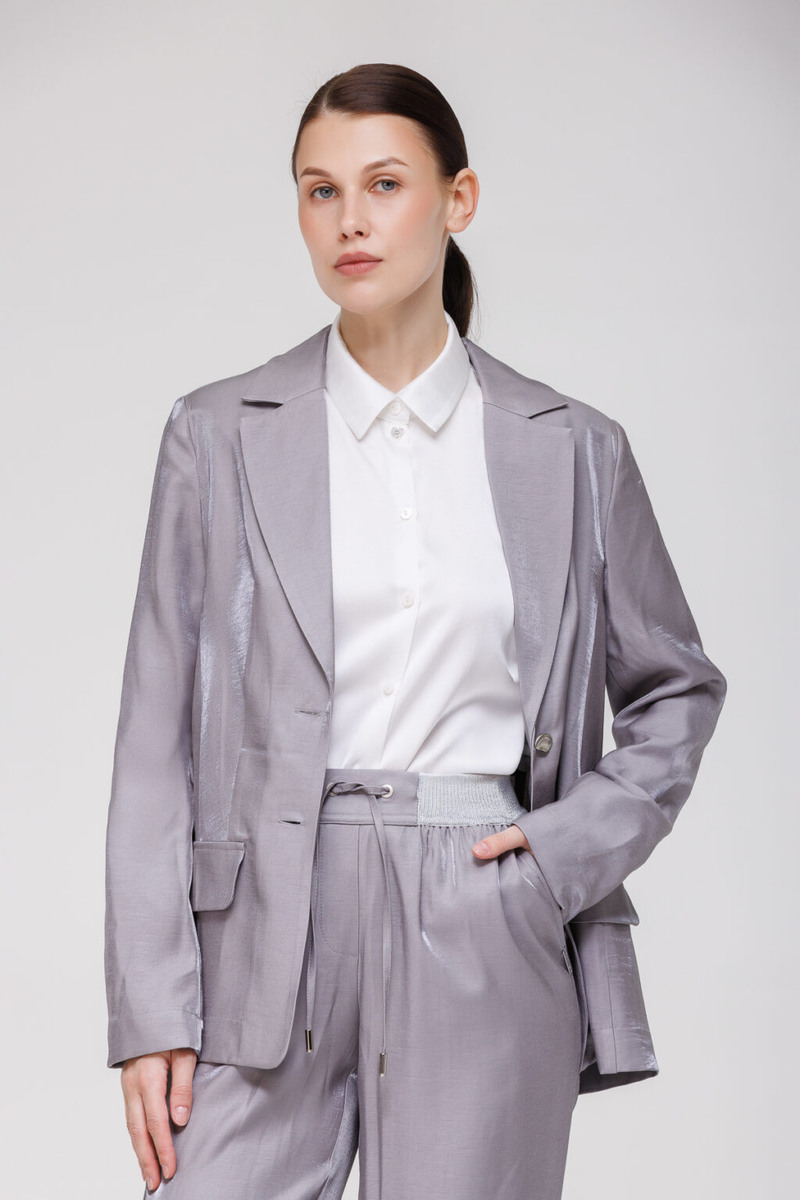 В новом сезоне в центре внимания — сложные, приглушённые оттенки. Лилово-серый — один из них. Он не кричащий, не излишне холодный и не слишком тёплый. Это универсальная база, которая выглядит современно и легко вписывается в повседневный гардероб. Но главное — не сам цвет, а то, как он работает в капсуле. В новой коллекции мы собрали комплементарные вещи, которые сочетаются между собой и позволяют создавать разные образы: от деловых до расслабленных. Жакет прямого кроя из смесовой ткани на основе вискозы с лёгким глянцевым блеском задаёт структуру. Он держит форму, но не выглядит жёстким. В паре с зауженными брюками на эластичном поясе получается костюм, который одинаково уместен в офисе и на деловой встрече. Брюки комфортны за счёт эластичной резинки, а ткань добавляет аккуратный блеск. При этом комплект легко разделить: жакет можно надеть поверх юбки или платья, а брюки — сочетать с более расслабленными верхами. Оригинальная блузка с капюшоном и кулиской по низу добавляет динамики. Э