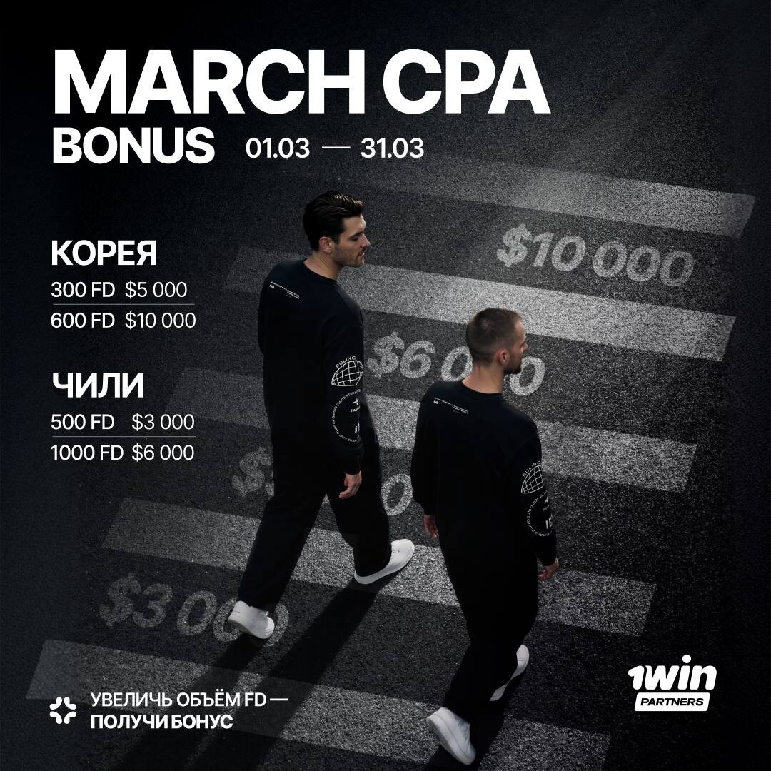 В марте 1win Partners добавляет плюс к твоей CPA-выплате по Южной Корее и Чили 🇰🇷 Корея: +300 FD — $5 000 +600 FD — $10 000 🇨🇱 Чили: +500 FD — $3 000 +1000 FD — $6 000 Учитывается только прирост FTD относительно итогового результата февраля Оплата начисляется за каждый достигнутый порог, количество бонусов не ограничено Акция действует до 31.03 Регистрируйся, фиксируй рост по обьему и забирай бонус ⚡