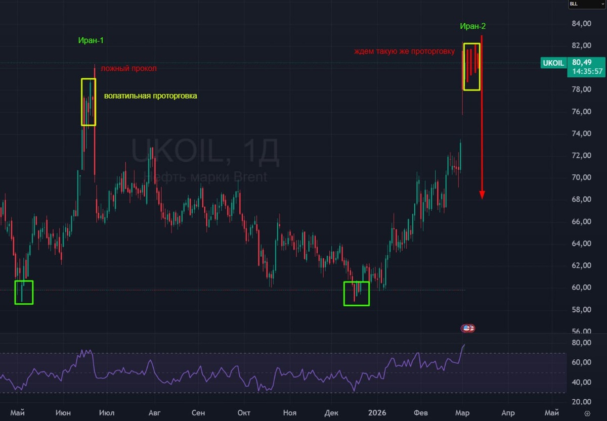 🛢 Нефть 🟢 Итак, нефть улетела вверх на военном конфликте. В прошлый раз война между США-Ираном-Израилем длилась 8 сессий, потому всех закончились ракеты. Я бы ожидал примерно такого же сценария. Истории роста нефти начинаются с одного и того же уровня, и сейчас тоже торгуемся на тех же уровнях, что и при прошлом конфликте. 🟢 В желтом прямоугольнике выделал проторговку, которая хоть и была волатильной, но была относительно стабильной, и держалась на одной высоте. Примерно такую же проторговку буду ждать и сейчас. Закончилось это все ложным выходом вверх. после чего нефть отвалилась вниз на 66 долларов. 🚗 Как будет развиваться ситуация в текущем конфликте - не известно, но опыт прошлого нам может служить опорой для понимания длительности и характера поведения нефти при таком конфликте. Я не исключаю, что и здесь можем получить закол наверх перед сильным падением. #нефть #brent #br1 #bogdanoffinvest $BRJ6 $BMJ6 $BRK6 $BMK6 $BRM6 $BMM6