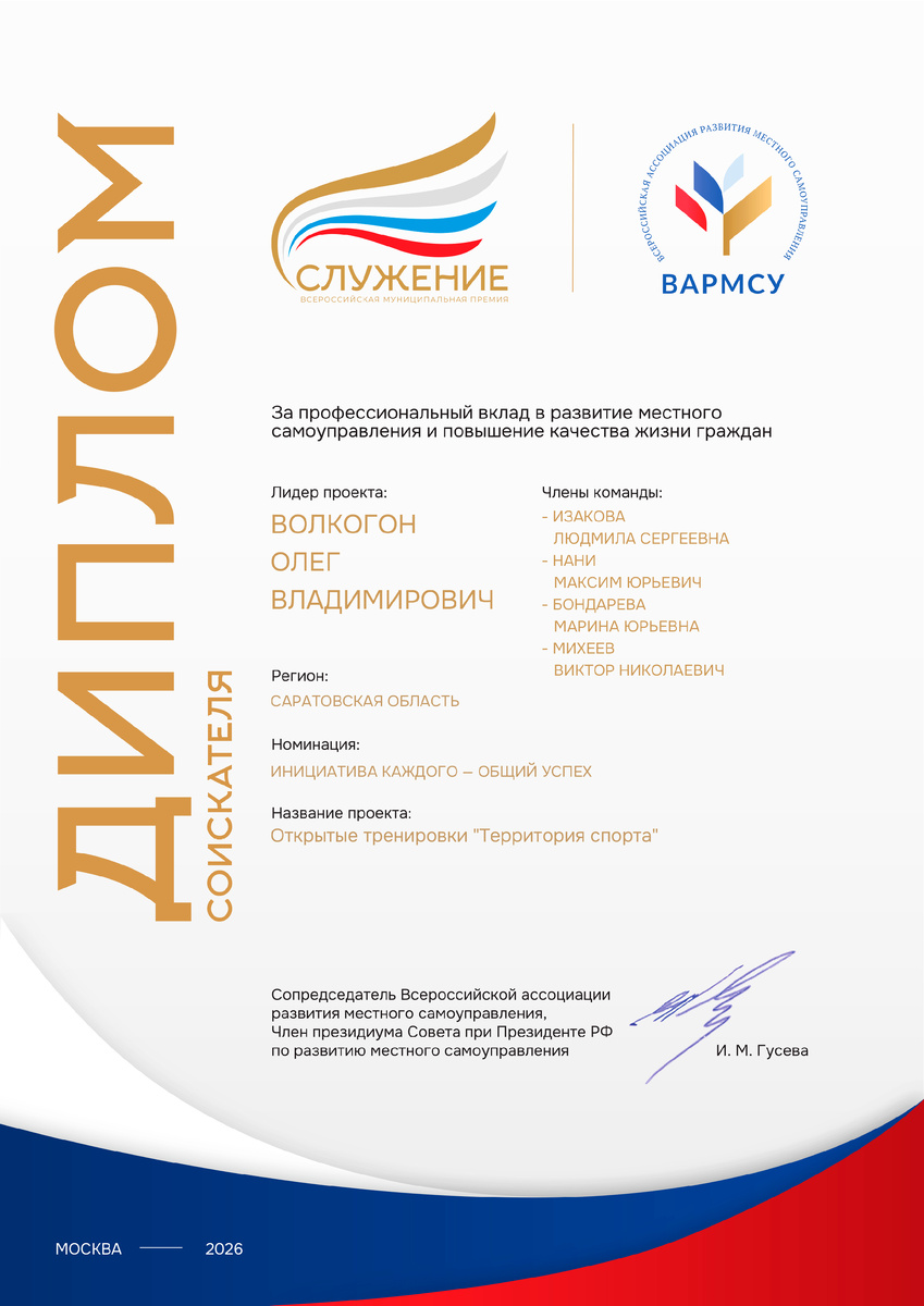 🌟 Друзья, хочу поделиться итогами участия во Всероссийской муниципальной премии «Служение» — премии, учреждённой по поручению Президента РФ Владимира Путина для тех, кто реально меняет жизнь в своих городах! 🇷🇺 ➖➖➖➖➖➖➖➖ Мы прошли долгий путь: от подачи заявки 21 октября до финального этапа утверждения ТОП-110 работ. За эти месяцы — первичный анализ, перекрёстная экспертиза, голосование Экспертного совета... Это был ценный опыт: научился ещё лучше оформлять результаты проекта «Территория спорта», оценивать чужие инициативы и видеть, как много людей по всей России ежедневно делают свою малую Родину лучше. 💪 ➖➖➖➖➖➖➖➖ В этот раз мы не вошли в число 110 финалистов, но получили диплом об участии — и это тоже важно! Потому что суть нашей номинации «Инициатива каждого — общий успех» не в наградах, а в результате. ➖➖➖➖➖➖➖➖ Побеждают лучшие — и это справедливо. А мы продолжим делать то, что умеем: проводить открытые тренировки, вовлекать подростков в спорт, создавать сообщество, где каждый в