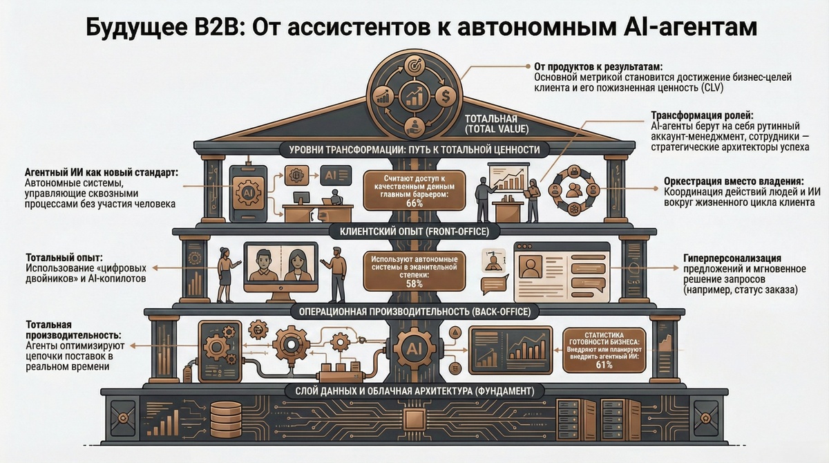 Раньше в B2B все строилось на долгих отношениях, контрактах и глубоком знании продукта. Сейчас это переворачивается. Цифровизация и ИИ меняют подход к делу. KPMG вводит понятие Total Value. Если просто: это когда опыт клиента, сотрудника и партнера сливаются в единую систему. Когда цифровое и человеческое работают вместе. Краткие выводы из отчета: ✨ 58% компаний уже используют автономные системы и агентный ИИ. Это не далекое будущее, это сейчас. ✨ Агенты ИИ берут на себя рутину: готовят контракты, анализируют риски, координируют команды, отслеживают поставки. А люди занимаются стратегией, сложными переговорами, там где нужна эмпатия. Интересный пример. Испанский банк внедрил целую систему роботов: один помогает клиентам, другой создает 360-градусный профиль клиента, третий автоматизирует риски. И все это движется к тому, что агенты банка и агенты клиента будут работать вместе. ✨ 66% опрошенных признают: главная проблема - это разрозненные данные, как и в любой автоматизации. Инфор