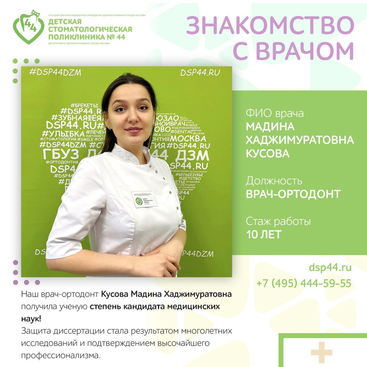 ! В рядах ученых врачей нашего коллектива прибыло!🎉 🤩Врач-ортодонт Кусова Мадина Хаджимуратовна, работающая в нашем коллективе с 2021 года, успешно защитила диссертацию на соискание ученой степени кандидата медицинских наук. 🎁Поздравляем Мадину Хаджимуратовну и ждем ее появления в рядах экспертных сообществ учреждения! 🤩🤩🤩 👤 Контакты для связи: 📞 Справочная служба: +7 (495) 444-59-55 🤩 Запись к ортодонту: https://clck.ru/3S7BVj 🖥 Сайт: dsp44.ru 📌 Наши адреса: clck.ru/3FJbk9 🤩🤩🤩 #dsp44 #dsp44dzm #дсп44 #детскаястоматологическаяполиклиника #департаментздравоохранения #стоматология #детскаястоматология #кмн #кандидатмедицинскихнаук✨