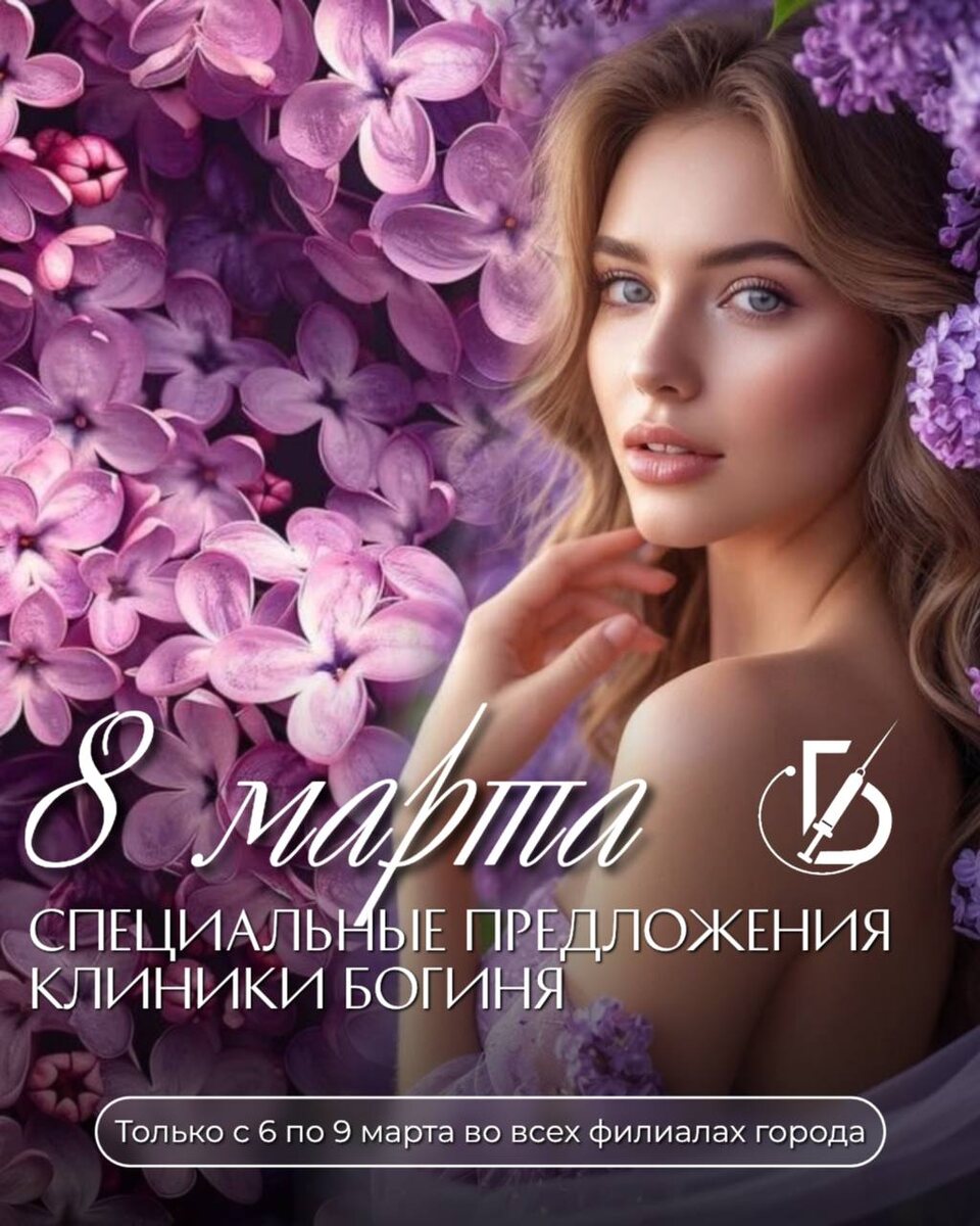 6 — 9 марта | Клиентские дни в «Богине» Что происходит в эти 4 дня во всех филиалах: ⚡️ Скидка 10% на все процедуры ⚡️ Скидка 10% на всю косметику ⚡️ Фотоомоложение лица или щек 3+1 в подарок ⚡️ Абонементы по специальным ценам ⚡️ Возможность спланировать уход за собой и на несколько месяцев вперёд Многие наши клиенты берут абонемент именно в Клиентские дни — потому что это просто очень выгодно и целесообразно 💡 10 марта цены вернутся к стандартным. Никаких исключений и «а можно как тогда?» — нет, к сожалению, нельзя будет. Поэтому — действуйте сейчас, скорее бронируйте за собой удобное время. Если интересны общие акции марта, то мы с удовольствием вам их пришлем. Вы можете отказаться от рассылки в любое время, просто написав слово "Отписаться" нам в ответном сообщении. Записаться: 😍 Онлайн: ➡️ https://n1039235.yclients.com 📞 Телефоны: +7(902)355-50-82 (б-р Новосондецкий, 11б) +7(902)355-55-86 (ул. Аблукова, 14) +7(987)688-31-15 (ул. Юго-Западная, 11) 📩 Напишите «ЗА