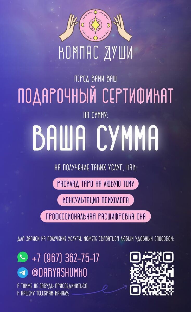 ‼️‼️‼️ Впереди еще один замечательный праздник, не забудь сделать своим знакомым или близким комплимент или полноценный отличный подарок 🔥🌷‼️ Ломаешь голову, что подарить на праздник коллегам или близким? Знаешь, что они давно хотели попробовать сходить к психологу или интересуются таро, но никак не могут решиться? У меня есть для тебя решение! Подарочный сертификат на любую услугу на выбор принимающего подарок: - Расклад на таро - Консультация психолога - Расшифровка снов Предлагаю сертификаты номиналом 500, 1000, 1500, 2000,2500 рублей 🙌🏼 (на другую сумму по договоренности - легко!) Сделай необычный и интересный подарок 🎁 Для заказа @daryashumko 🙌🏼