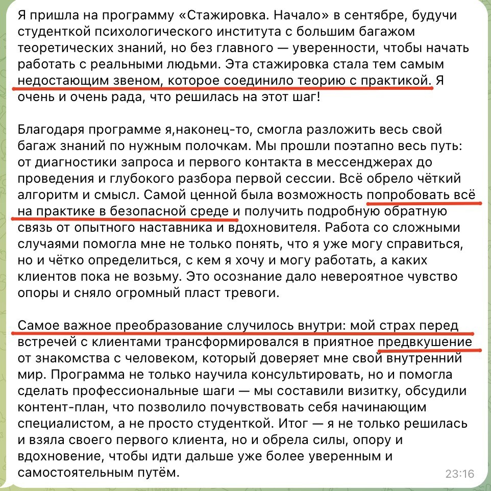 ? ☝️ 🔸 Научиться плавать на берегу все равно не получится, для этого надо зайти в воду. На программе мы соединяем теорию с практикой, это дает опору и понимание как это в реальности. 🔸 Безопасная среда, да, учиться плавать лучше не методом "меня просто кинули в воду и сказали, плыви" а с поддержкой, спасательным кругом и на мелководье, тогда можно избежать шока от новой деятельности 🔸 Трансформация страха в предвкушение... Классный итог! Из этого состояния вести блог, привлекать клиентов, говорить о том, что вы психолог и приглашать в работу гораздо проще и приятнее. Тогда практика и случается Записаться 👉 https://new-psycholog.tilda.ws/nachalo Начинаем 9 марта Следующий поток будет через полгода