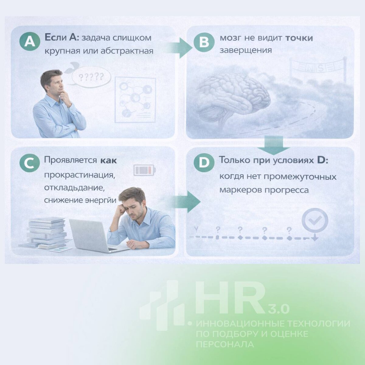 Есть распространённая иллюзия: дофамин - это гормон удовольствия. Это не про удовольствие. Это про ожидание и завершение. Мозг не награждает нас за мечты. 💭 Он награждает за замкнутый контур действия. Посмотрим на иллюстрацию к посту. Если A: возникает цель или намерение, тогда B: формируется ожидание результата (дофаминовый прогноз), это проявляется как C: внутреннее напряжение «нужно сделать», фокус внимания, мотивационный импульс, но только при условиях D: если существует реальная возможность довести действие до конца. Ключевой момент - завершённость. Дофаминовая система работает по принципу: ожидание → действие → результат → фиксация результата. Если цепочка обрывается, напряжение остаётся. Именно поэтому незавершённые задачи «висят» в голове. Это не характер. Это незакрытый нейронный контур. Здесь работает эффект, который в когнитивной психологии описан давно: незавершённое запоминается лучше завершённого. Мозг держит открытые петли, потому что они потенциально важны для вы