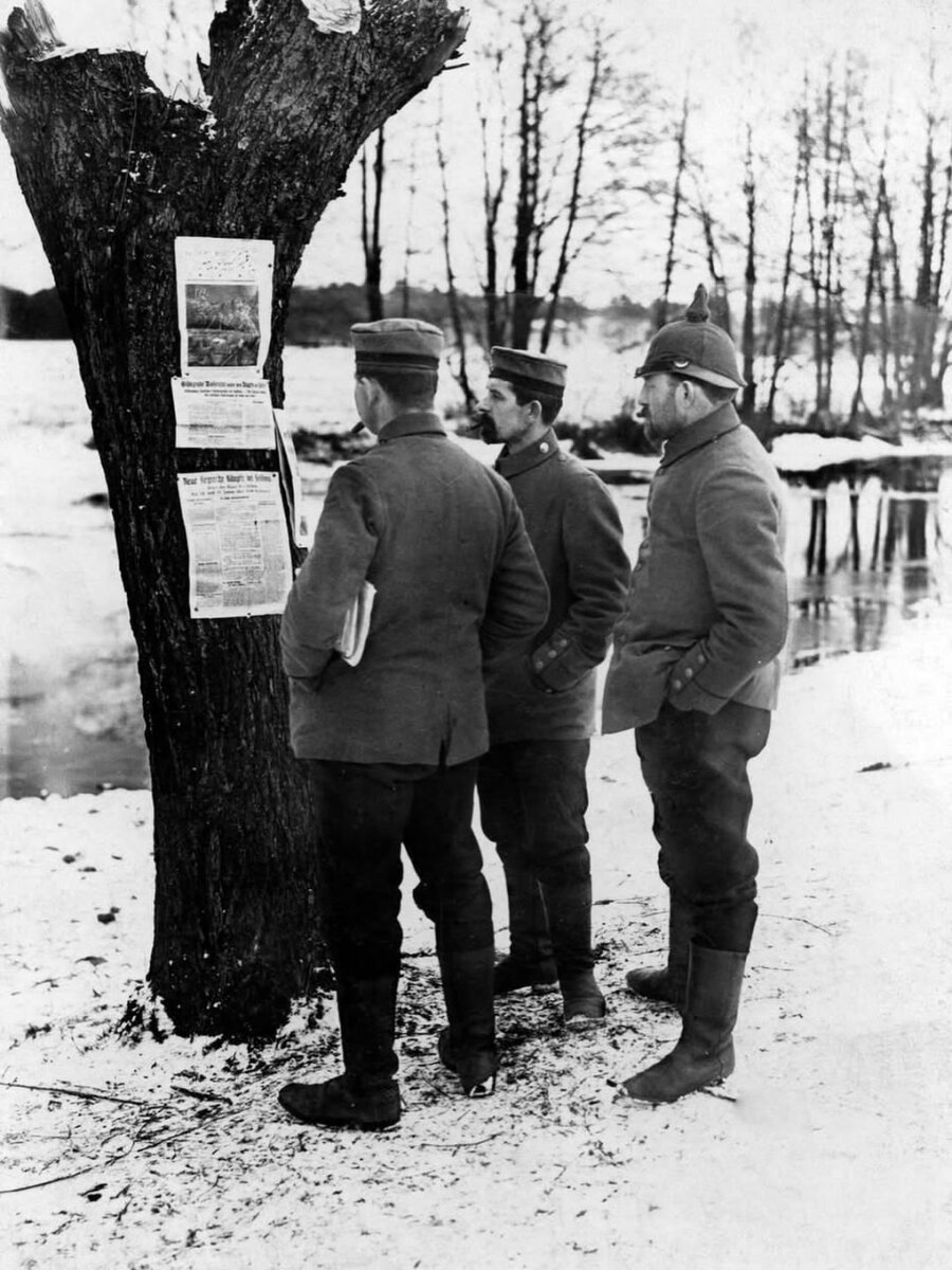Германские солдаты читают новости о событиях на Западном фронте из какой-то части Восточного фронта, на территории современной Польши, примерно март 1915 года.