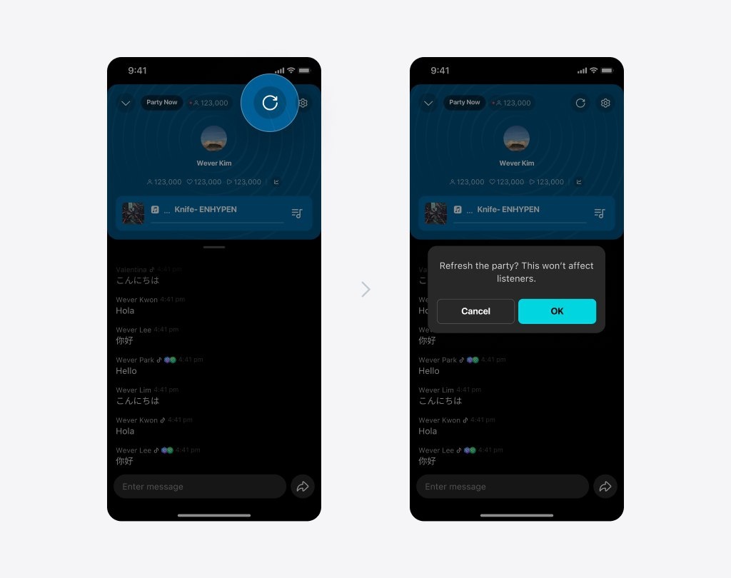 Здравствуйте от Weverse. У нас отличные новости о новых обновлениях Weverse, которые выйдут 3 марта. Обновите приложение Weverse до последней версии уже сейчас, чтобы опробовать совершенно новое приложение Weverse. 1. Обновлённая функция для вечеринок прослушивания: Теперь вы можете обновить подключение вашей вечеринки прослушивания к музыкальной платформе. Для обеспечения более стабильных сессий вечеринки прослушивания на экране вечеринки у ведущего добавлена кнопка "обновить". Если во время сессии треки воспроизводятся некорректно, ведущий может нажать кнопку "обновить", чтобы обновить подключение к музыкальной платформе. 2. Weverse Spot: Изучайте офлайн-мероприятия, получайте обновления на месте и улучшайте свой опыт. Новое меню Weverse Spot позволяет легко быть в курсе событий и участвовать в мероприятиях Weverse, включая концерты, pop-up пространства, фестивали и многое другое. Следите за новостями и обновлениями в реальном времени прямо с места событий через Weverse Spot. Г