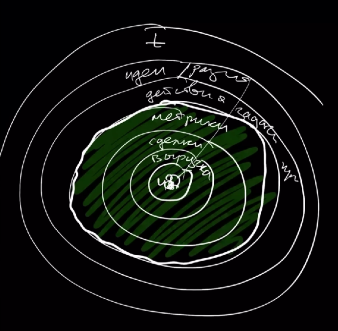 Согласно этой логике мы понимаем, что от периферии к центру что-то меняется. Меняется уровень конкретики, меняется уровень чистого эквивалента результата. Если мы расположим людей по этим кругам в организации, то ближе к центру, скорее всего, будет собственник или генеральный директор. То есть тот человек, который способен взять ответственность за чистую прибыль и обеспечить ее. Неважно, сколько времени он работает, неважно, о чем он разговаривает, неважно, какие задачи делает — если нет чистой прибыли, значит, он не создает результат.