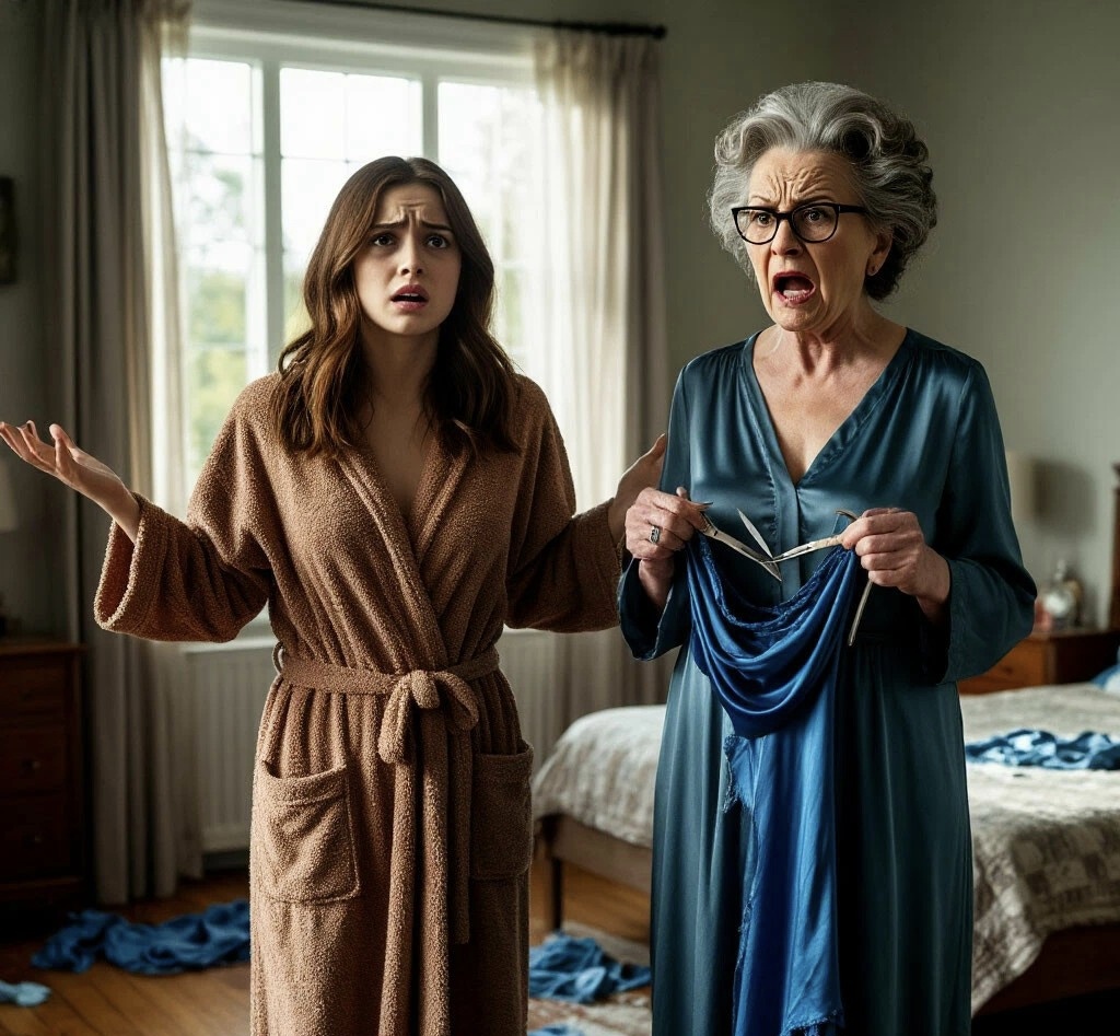 Валентина Ивановна стояла посреди комнаты. В одной руке она держала платье Анны, в другой — большие портняжные ножницы, которыми обычно кроила старые простыни на тряпки. Синий шёлк был уже не идеальным. От подола, почти до самого колена, тянулся длинный, неровный разрез. Края ткани противно топорщились. Но хуже было другое. На лифе, там, где вырез, зияла ещё одна прореха. Ножницы уже сделали своё дело.