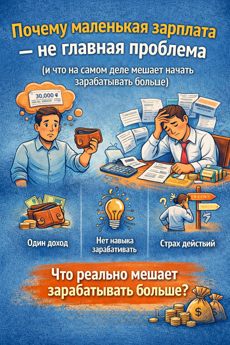 Большинство людей уверены: «Вот была бы зарплата 150–200 тысяч — тогда бы всё наладилось». Но практика показывает обратное. Люди с доходом 50 000 ₽ живут в минус. Люди с доходом 250 000 ₽ — тоже живут в минус. И дело не в сумме. Дело в системе. Сегодня разберёмся, почему маленькая зарплата — это не всегда главная проблема, и что действительно мешает расти в доходе. Иллюзия №1: «Мне просто мало платят» Да, в регионах зарплаты низкие. Да, рынок труда не идеален. Но если честно ответить себе на вопрос: Что я делаю, чтобы увеличить доход? Обычно ответ звучит так: «Ну… работаю» «Жду повышения» «Смотрю вакансии иногда» Это не стратегия. Это ожидание. Главная проблема №1: Один источник дохода Если у человека только одна зарплата — он полностью зависим. От: начальника компании рынка экономической ситуации И любое сокращение или кризис выбивает почву из-под ног. Даже 5–10 тысяч дополнительного дохода в месяц дают психологическую устойчивость. Главная проблема №2: Нет навыка «зарабатывать» Школа