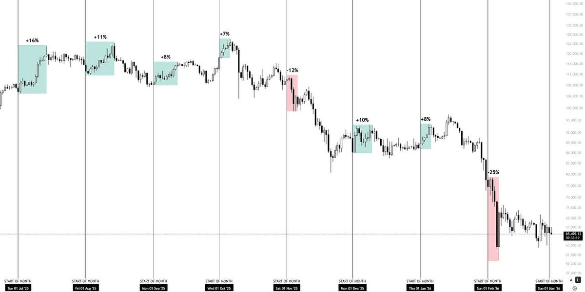 Коллеги, посмотрите на простую статистику. За последние 6–8 месяцев после открытия нового месяца BTC в среднем давал +6–7% от Monthly Open. Не 20%. Не иксы. А аккуратный, системный импульс вверх. Если разложить по факту: +16% +11% +8% +7% +10% +8% И только в двух случаях мы увидели ощутимый минус: -12% и -25%. Но важно другое. Оба снижения произошли не “просто так”. Это были моменты, когда рынок уже находился на грани структурного перелома. Когда давление накапливалось заранее. То есть сам по себе новый Monthly Open не является триггером падения. Он лишь подсвечивает текущее состояние тренда. Что это значит сейчас? Если рынок: — в структуре накопления — без явных признаков слома тренда — без каскада ликвидаций то статистически вероятность локального ап-движения в первые недели месяца выше, чем мгновенного обвала. Но если: — тренд уже нарушен — доминация уходит — макро усиливает давление тогда Monthly Open может стать точкой ускорения вниз. Ключевая мысль. Открытие месяца