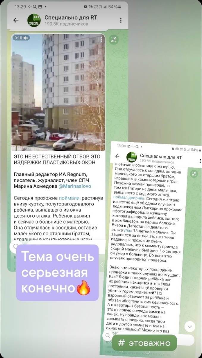 Сегодня прохожие поймали, растянув внизу куртку, полуторагодовалого ребёнка, выпавшего из окна десятого этажа. Ребёнок выжил и сейчас в больнице с матерью. Она отлучалась к соседям, оставив маленького со старшим братом, игравшим в компьютерные игры. Похожий случай произошёл в том же Питере на днях: мальчика, выпавшего с седьмого этажа, поймал дворник. Сегодня же стало известно ещё об одном случае: в подмосковном Лыткарино прохожие сфотографировали женщину, которая высадила ребёнка, одетого в комбинезон, на перила балкона. Вчера в Дагестане с девятого этажа упал 13-летний мальчик. Он зацепился за ветки, это смягчило падение, и прохожие очень радовались, что к моменту приезда скорой мальчик был жив. Но сегодня он умер в больнице. Во всех этих случаях проводится проверка.