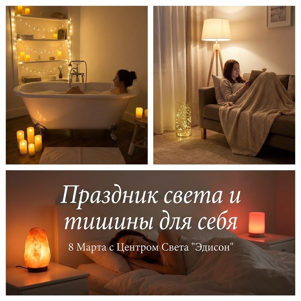 Когда мы думаем про 8 Марта, воображение часто рисует букеты, застолья или романтический ужин. И это прекрасно!🌹 Но в бесконечной гонке рабочих будней и заботе о близких, дним из ценных подарков, который Вы можете сделать себе в этот день, — это время.⌛ 💡Праздник может стать разрешением на остановку. И простым, но магическим способом создать атмосферу полного расслабления является свет. 💫Мы предлагаем превратить Ваш дом в персональный спа-ретрит, используя только силу света в трёх главных зонах отдыха. 🛁 Ванная комната: Храм очищения Ванная — это место, где можно смыть накопленное за день напряжение. Но обычная потолочная лампа превращает этот ритуал в рутину. Откажитесь от верхнего света. Зажгите несколько светодиодных свечей разной высоты или влагозащищённые гирлянды с тёплым светом. Расставьте их на полках. Огонь будет отражаться в воде, создавая гипнотическую игру бликов. Добавьте соль для ванн с лавандой — в мягком свете свечи даже привычные ароматы зазвучат иначе. 🛋️ Гостина