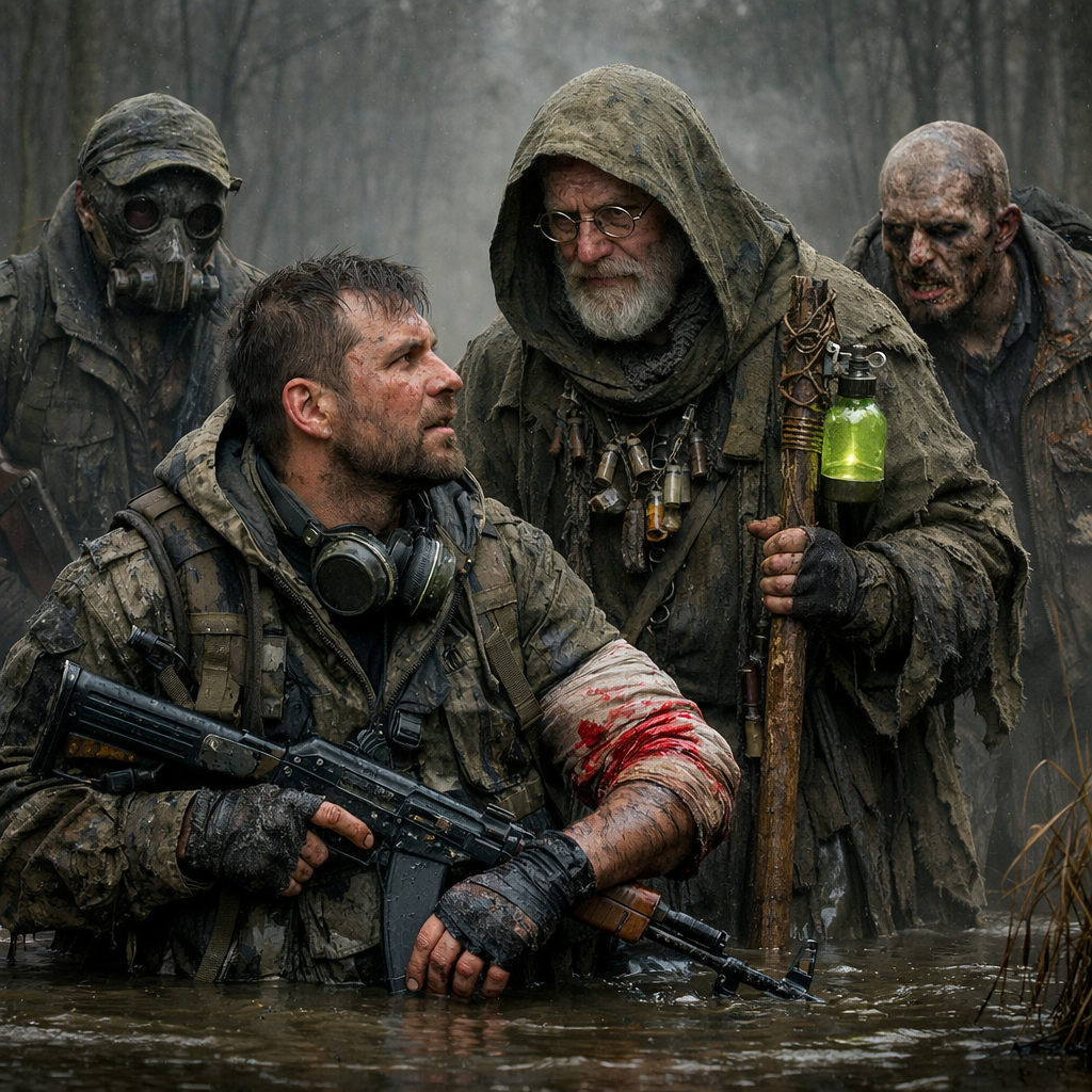 Несколько минут Сопло так и лежал в окружении монстров, тяжело дыша и переводя дух. Понемногу шок начал проходить, и ему на смену пришла жуткая боль в ноге и руке. Он открыл нагрудный карман и извлёк маленькую аптечку синего цвета. Вколов обезболивающее, он на несколько секунд потерял сознание, а когда пришёл в себя, принялся за перевязку. Рана на ноге была неглубокой, промыв её спиртом, он надёжно перевязал её. С рукой всё было намного хуже. На ней не хватало куска кожи и, возможно, мышц размером с полпачки галет. Кровь бежала так быстро, как убегает молоко у невнимательной домохозяйки. Сопло достал жгут, перетянул руку чуть выше раны, принялся её обрабатывать и бинтовать. В голове почти не было мыслей, а сильное обезболивающее из армейской аптеки путало те, которые остались. Через десять минут кропотливой работы он наконец закончил и закурил. Докуривая, он увидел впереди движение. Вот незадача. Автомат не стреляет, в пистолете пусто. Перезарядить оружие сразу, в пылу эмоций, он просто-напросто забыл. Фигуры были похожи на человеческие, но это всё равно ничем хорошим не могло закончиться. Видимо, они пришли сюда на звук боя, который Сопло дал мутантам и победил. Когда они почти вплотную приблизились к сталкеру, он сначала замер от страха, а потом с облегчением выдохнул. Это был Болотный Доктор со своим ручным зомби по кличке Бенито…