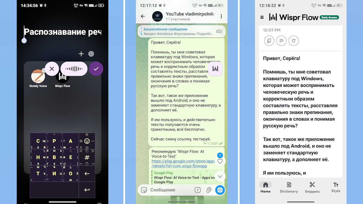 В конце материала вас будет ждать ссылка на видеоинструкцию по работе с программой 📺 Сегодня речь пойдёт об ИИ‑помощнике, который ⚠️ не заменяет вашу клавиатуру, к которой вы привыкли, а дополняет её. Над вашей действующей клавиатурой появится кнопка‑пузырь, нажав на которую вы активируете набор текста голосом — чем это отличается, например, от голосового ввода Google, который встроен по умолчанию в ваш телефон? Стандартный голосовой набор примитивен, так как текст воспринимается просто как набор слов, которые сумел распознать голосовой движок Google. Там нет знаков препинания, даже если вы что‑то перечисляете; по контексту предложения движок Google не в состоянии понять, задаёте ли вы вопрос, кричите на кого‑то и