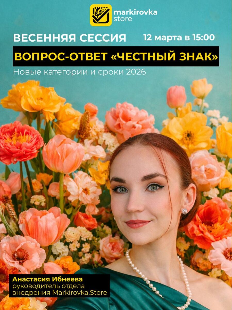 😌 Прямой эфир для тех, кто хочет быть в теме изменений, которые ждут предпринимателей в сфере «Честный знак». Обсудим новые категории и сроки 2026, ответим на интересующие вопросы и поможем в сложных ситуациях. Когда? ✍️12 марта ✍️15:00 (по мск) Анастасия Ибнеева, руководитель отдела внедрения markirovka.store и невероятный эксперт в теме «Честного знака» ждет вас! Регистрация открыта