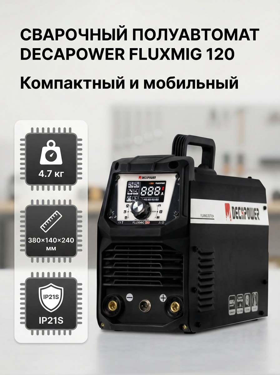 Хорошая новость: полуавтомат без газа — один из самых понятных способов начать. Он похож на бытовой гаджет: нажал кнопку — “нитка” (проволока) пошла, шов формируется быстрее и спокойнее, чем электродом. Сегодня разбираю DECAPOWER FLUXMIG 120 — компактный инверторный полуавтомат без газа, который умеет сразу три режима: