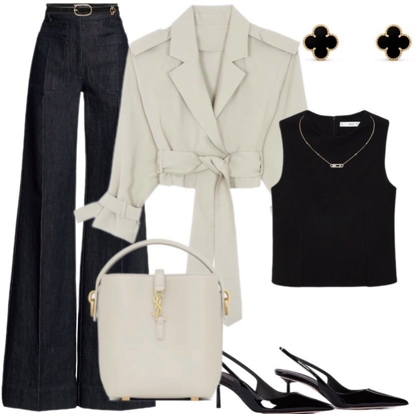 Этот образ — пример того, как выглядеть роскошно без чрезмерности. Темный клеш вытягивает и стройнит, молочный жакет с поясом формирует идеальные пропорции, черный топ добавляет графику и собранность, а аксессуары с теплым металлом делают комплект завершенным и «дорогим» по ощущению. Это универсальная весенняя формула: достаточно поменять обувь или сумку — и вы легко переходите от дневного города к вечернему настроению.
