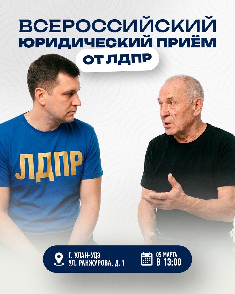 ! 5 марта в 13:00 в Улан-Удэ состоится юридический приём граждан, на котором юрист Бурятского регионального отделения ЛДПР ответит на вопросы жителей республики. Каждый желающий сможет получить профессиональную консультацию по вопросам жилищного, трудового, семейного, земельного и иного законодательства. Место проведения: г. Улан-Удэ, ул. Ранжурова, д. 1. Предварительная запись осуществляется по телефону + 7(3012) 21-23-63 Не оставайтесь один на один со своей проблемой — специалисты ЛДПР готовы помочь и защитить ваши законные права.
