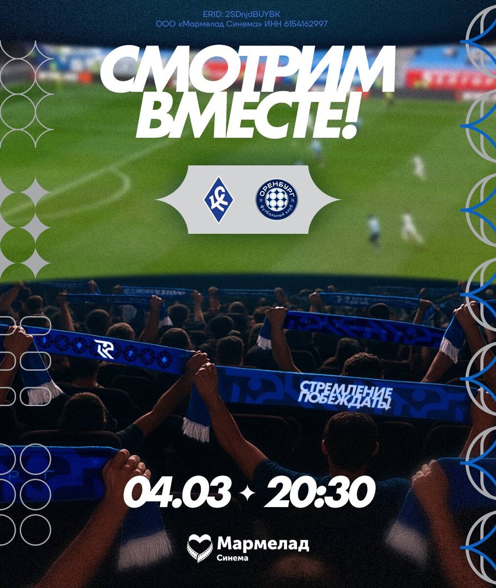 🍿 Наши друзья из «Мармелад Синема» организовывают просмотр матча против «Крыльев Советов» на большом экране кинотеатра. Вы можете поддержать любимую команду в комфортных условиях кинозала. Билеты по ссылке. #ФКОренбург #ОренбургКрыльяСоветов